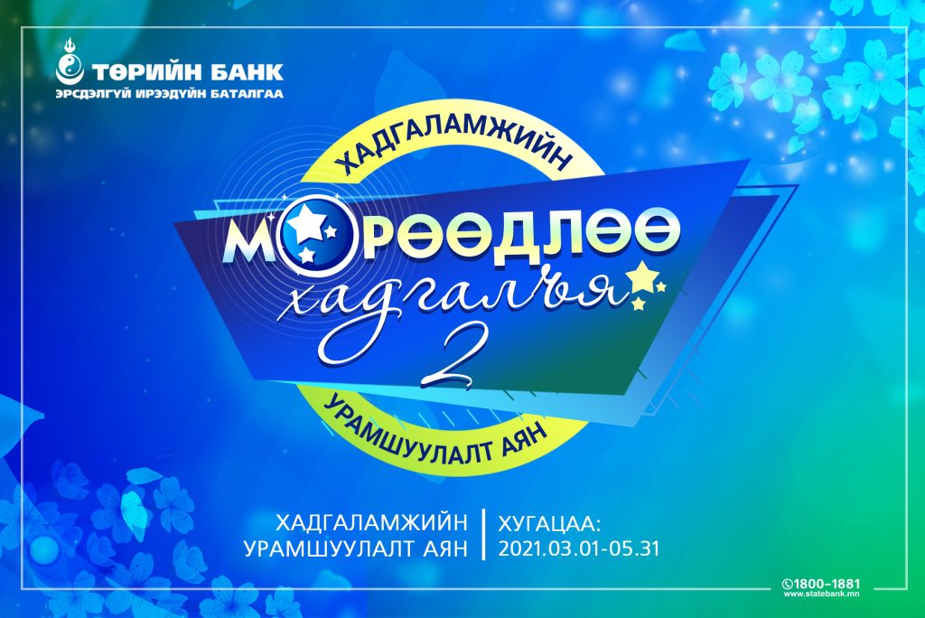 Төрийн банканд 3 сар буюу түүнээс дээш хугацаатай хадгаламж нээлгэсэн, хугацаагаа сунгасан, хадгаламждаа орлого нэмсэн 100,000 төгрөг тутамд 1 сугалааны эрхтэйгээр “Мөрөөдлөө хадгалъя” хадгаламжийн урамшуулалт аянд оролцох боломжтой.