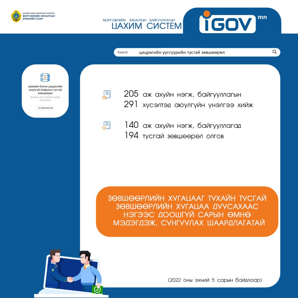 Холбогдох хууль тогтоомжийн дагуу энэ төрлийн үйл ажиллагаа эрхлэхэд Мэргэжлийн хяналтын байгууллагаас тусгай зөвшөөрөл авдаг. 2021 онд Мэргэжлийн хяналтын байгууллага цахим системээр энэ төрлийн үйл ажиллагаа эрхлэхтэй холбоотой нийт 315 аж ахуйн нэгж, байгууллагаас ирүүлсэн 700 орчим хүсэлтийг хүлээн авч шийдвэрлэсэн. Энэ оны эхний таван сарын байдлаар 205 аж ахуйн нэгж, байгууллагаас ирүүлсэн 291 хүсэлтэд аюулгүйн үнэлгээ хийж, 140 аж ахуйн нэгж, байгууллагад цацрагийн үүсгүүр ашиглах, хадгалах, экспортлох, импортлох, тээвэрлэх 194 тусгай зөвшөөрлийг олгож, аюулгүй шаардлага хангаагүй хүсэлтүүдийг буцаагаад байна.