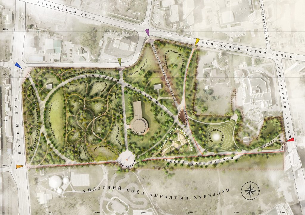 Зурагт харагдаж буйгаар цэцэрлэгт хүрээлэнгийн 80 хувь нь өөрөө өөрийгөө нөхөн сэргээх боломжтой ногоон байгууламж, 20 хувь нь иргэдийн чөлөөт цагаа өнгөрөөх тухлах талбай болон дасгал хөдөлгөөн хийх орчин буюу автомашингүй, хүүхдүүдэд ээлтэй, их хотын дуу чимээнээс хол байх шийдэлтэй.